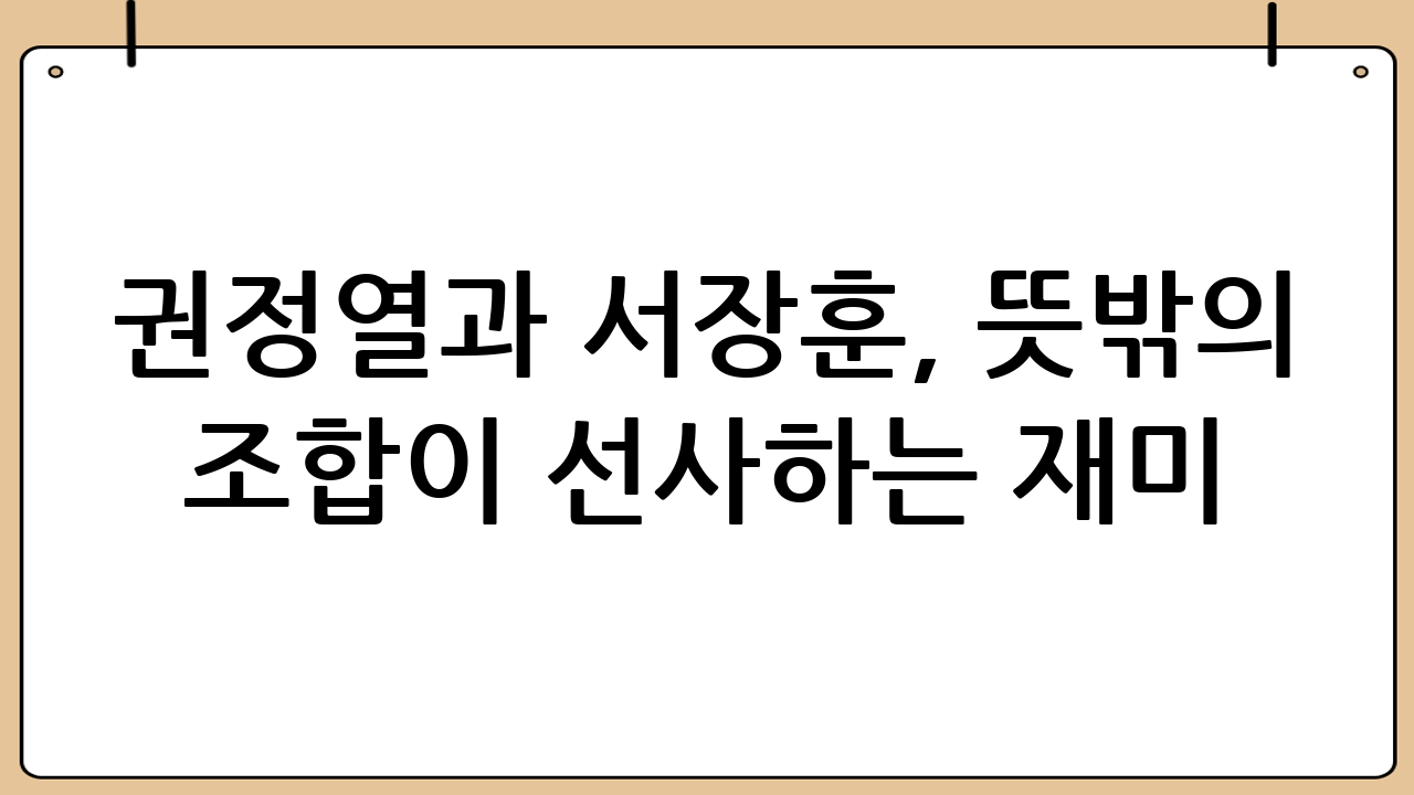 권정열과 서장훈, 언뜻 보기에는 전혀 어울리지 않는 조합처럼 보일 수 있습니다. 하지만 두 사람은 예능 프로그램에서 만나 환상의 케미스트리를 선보이며 시청자들을 사로잡았습니다. 권정열의 엉뚱함과 서장훈의 냉철함이 만나 예상치 못한 웃음을 만들어내고, 서로를 존중하고 배려하는 모습은 훈훈함을 자아냅니다. 특히, 서장훈은 권정열의 엉뚱한 질문에 당황하면서도 재치 있게 받아치는 모습을 보여주며 웃음을 선사하고, 권정열은 서장훈의 진솔한 조언에 귀 기울이며 진지한 모습을 보이기도 합니다. 이처럼 두 사람은 서로의 부족한 부분을 채워주며 완벽한 호흡을 자랑합니다.